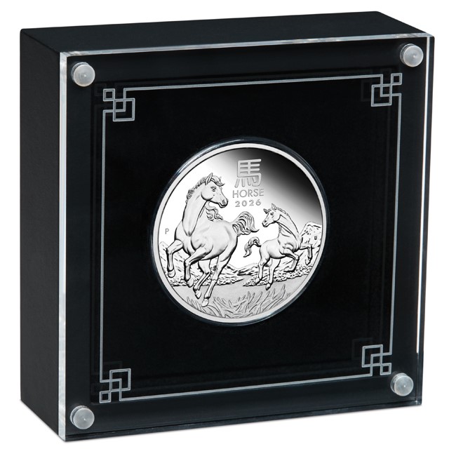 Η συλλογή Australian Lunar Series III του Νομισματοκοπείου Perth συνεχίζει την πλούσια παράδοση κοπής εντυπωσιακών νομισμάτων πολύτιμων μετάλλων, απεικονίζοντας ζωικά θέματα από το κινεζικό σεληνιακό ημερολόγιο. Ο οπισθότυπος σχεδιασμός αλλάζει κάθε χρόνο βάσει του κινεζικού σεληνιακού ημερολογίου, και ο οπισθότυπος του 2026 γιορτάζει το Έτος του Ίππου. Όσοι έχουν γεννηθεί υπό το ζώδιο του κινεζικού σεληνιακού ίππου το 2026, 2014, 2002, 1990, 1978 και κάθε 12ο προηγούμενο έτος, λέγεται ότι είναι χαρισματικοί, ανεξάρτητοι και έχουν μεγάλη αγάπη για την περιπέτεια. Ο οπισθότυπος απεικονίζει μια μεγαλοπρεπή φοράδα μαζί με το νεαρό πουλάρι της, και οι δύο αποδίδονται με κομψές χαίτες σε εντυπωσιακή καλπάζουσα στάση. Το φόντο περιλαμβάνει επιβλητικά βουνά και τη γαλήνια ομορφιά των λιβαδιών. Επίσης, στο σχέδιο περιλαμβάνεται ο κινέζικος χαρακτήρας για τον “ίππο”, η επιγραφή «HORSE 2026» και το σημάδι νομισματοκοπείου “P” του Perth Mint.