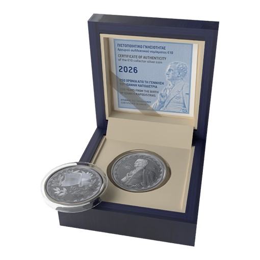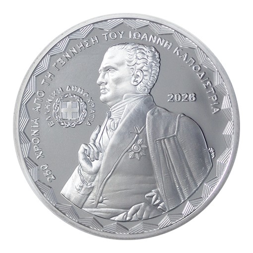 Αργυρό νόμισμα 10 ευρώ 2026 αφιερωμένο στα 250 ΧΡΟΝΙΑ ΑΠΟ ΤΗ ΓΕΝΝΗΣΗ ΤΟΥ ΙΩΑΝΝΗ ΚΑΠΟΔΙΣΤΡΙΑ. Γόνος αριστοκρατικής οικογένειας, ο Ιωάννης Καποδίστριας γεννήθηκε στην Κέρκυρα το 1776 και σπούδασε ιατρική, φιλοσοφία και νομική στην Ιταλία. Μετά την επιστροφή του στην Κέρκυρα συμμετείχε ενεργά στα πολιτικά πράγματα των Επτανήσων, έως ότου εντάχθηκε στο διπλωματικό σώμα της Ρωσίας το 1808. Ως απεσταλμένος του Τσάρου Αλεξάνδρου Α΄, ο Καποδίστριας συνέβαλε στην επίλυση του πολιτειακού προβλήματος της Ελβετίας. Αν και θεωρούσε την Ελληνική Επανάσταση πρόωρη, ως Υπουργός Εξωτερικών της Ρωσίας αγωνίστηκε για να εμποδίσει την επέμβαση των Μεγάλων Δυνάμεων υπέρ των Οθωμανών, αλλά εν τέλει περιέπεσε σε δυσμένεια και αποχώρησε το 1822. Εξελέγη Κυβερνήτης της Ελλάδος από την Γ΄ Εθνοσυνέλευση το 1827 και διαπραγματεύθηκε με δεξιοτεχνία ώστε να επιτύχει την παραχώρηση ανεξαρτησίας στην Ελλάδα και την επέκταση των συνόρων της. Έθεσε τα θεμέλια του νέου κράτους, δημιουργώντας κεντρική διοίκηση, οικονομικούς θεσμούς και τακτικό στρατό, ενώ παράλληλα προώθησε την εκπαίδευση, τη γεωργία και τα τεχνικά επαγγέλματα. Ήλθε όμως σε σύγκρουση με κατεστημένα συμφέροντα, με αποτέλεσμα τη δολοφονία του στις 27 Σεπτεμβρίου 1831.
