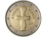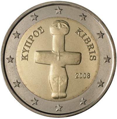 The inner circle of the coin depicts a cross-shaped idol dating back to the chalcolithic period (3000 B.C.), from the village of Pomos which is a characteristic example of Cypriot prehistoric art.