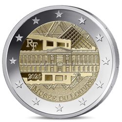 In 2025, France issues a euro coin celebrating the Louvre Museum. This iconic monument, a symbol of French cultural heritage, is one of the most famous museums in the world. Indeed, it houses must-see works, such as the Mona Lisa or the Venus de Milo. In addition, its unique architecture combines historical heritage and modernity. Thus, this coin pays tribute to the importance of the Louvre in the history of art and culture. The obverse of the coin features an architectural composition highlighting the Louvre Museum. Indeed, it shows a detailed representation of the classical facade of the palace. This historic building, a former royal palace, is decorated with numerous sculpted windows and columns. In addition, each detail highlights the architectural richness of the monument. Behind the facade, the glass pyramid, designed by architect Ieoh Ming Pei, is also represented. This contrast between old and modern perfectly illustrates the museum’s identity. In addition, geometric lines in the background suggest a view of the glass roof from different angles. These graphic elements reinforce the depth and dynamism of the design.