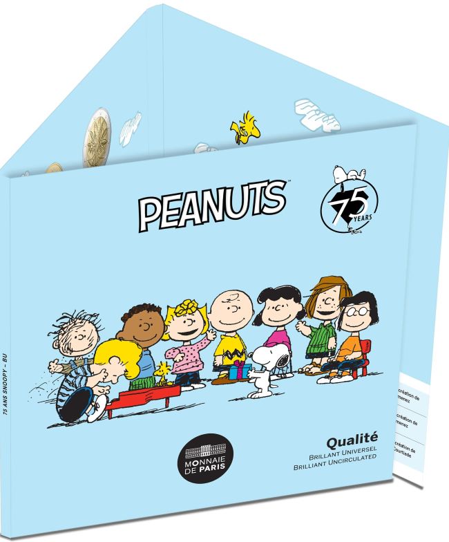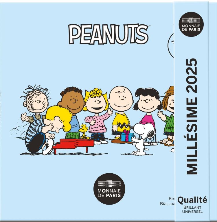 In 2025, to mark the 75th anniversary of Peanuts, Monnaie de Paris celebrates the famous gang of friends. Snoopy is the main character of the collection and decides to cross the Atlantic ocean to travel to France for his birthday. This BU miniset contains circulating euros struck in BU quality, from the cent to the €2 coin. Limited mintage 500 sets only.