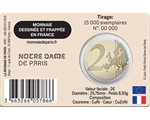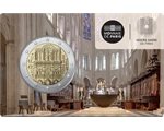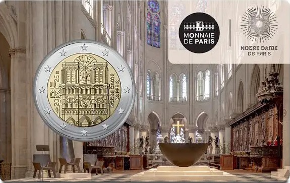 Notre-Dame de Paris. The Cathedral of Notre-Dame de Paris, commonly known as Notre-Dame, is one of the most iconic monuments of the city of Paris and of France. Located on the Ile de la Cite, it is a Catholic place of worship and serves as the seat of the Archdiocese of Paris, dedicated to the Virgin Mary. Its construction began in 1163 at the initiative of Bishop Maurice de Sully and spanned nearly two centuries, being completed in the mid-14th century. The devastating fire of April 15, 2019 destroyed the spire and the entire roof covering the nave, the choir, and the transept. This was the most serious disaster the cathedral had suffered since its construction. Rebuilt identically, the cathedral was reopened to the public on December 8, 2024. The twelve stars of the European Union are represented in the outer ring of the coin.
