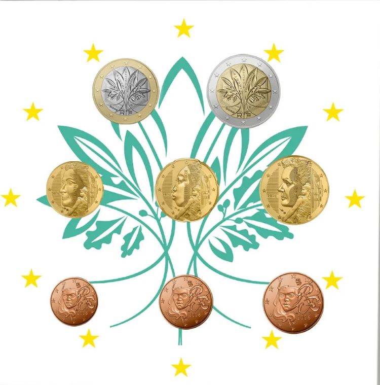 France 2026 BU Set, 8 french circulating denominations - Brilliant Uncirculated quality yeardate 2026. This official series contains the eight French circulation coins in Brilliant Uncirculated (BU) quality. The packaging honors the figure of the Genius. The €1 coin is struck exclusively for the BU and BE series and will not be struck in circulating quality in 2026.