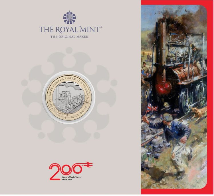 200 Years of The Modern Railway 2025 UK £2 Brilliant Uncirculated Coin. Celebrating 200 years of the modern railway and the seminal journey that changed the world. William Webb’s reverse design portrays the revolutionary journey that took place on 27 September 1825. In tribute to the original locomotive, the coin features the edge inscription ‘ACTIVE · LOCOMOTION NO 1’. Presented in bespoke packaging that explores the huge impact the railway has had on people’s lives since 1825. Made in partnership with Railway 200 as part of its year-long celebration of 200 years of the modern railway.