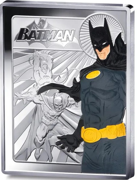 Batman, le Chevalier Noir, a suivi en 1939, protégeant Gotham avec ses gadgets high-tech et sa célèbre batmobile. Enfant, Bruce Wayne a vu ses parents se faire brutalement tuer dans l’Allée du Crime de Gotham City. Traumatisé par leur mort, il a consacré sa vie à devenir la plus grande arme du monde contre le crime : Batman ! Pour devenir le justicier ultime, le Chevalier Noir a travaillé son corps et son esprit pour atteindre le summum de la supériorité mentale et physique. Il est un maître détective et un expert en arts martiaux, mais sa plus grande arme est son esprit. Batman a un plan pour chaque occasion, ainsi que des armes, des gadgets et des véhicules de haute technologie pour l'aider dans sa poursuite incessante de la justice ! Sur la face, on retrouve Batman et son évolution graphique. Son costume iconique est sublimé par la colorisation. On retrouve au revers de cette monnaie, une représentation de la Justice League en format bande dessinée avec la mention « 90 ans ». Le revers présente également la valeur faciale de la monnaie ainsi que le sigle de la république française.