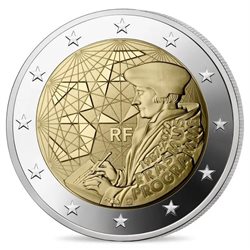Monete 2 euro, 35 anni del programma Erasmus. Il disegno unisce due elementi principali del programma Erasmus: l’ispirazione intellettuale all’origine del programma, Erasmo stesso, e l’allegoria della sua influenza in Europa. Il primo elemento è simboleggiato da una delle raffigurazioni più note di Erasmo. Il secondo è simboleggiato da una rete luminosa di collegamenti che attraversano la moneta da un punto all’altro, rappresentando in tal modo i numerosi scambi intellettuali e umani tra gli studenti europei. In riferimento all’Europa, alcuni di questi collegamenti formano altre stelle, nate dalla sinergia tra i paesi. Dalle stelle emerge, in grafica contemporanea, il numero 35 in omaggio al 35° anniversario del programma. Il disegno è stato creato da Joaquin Jimenez, incisore professionista presso la Monnaie de Paris.