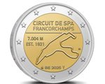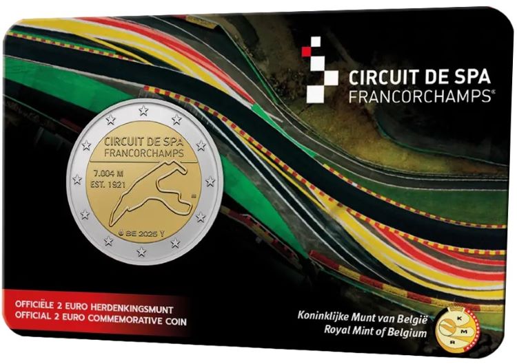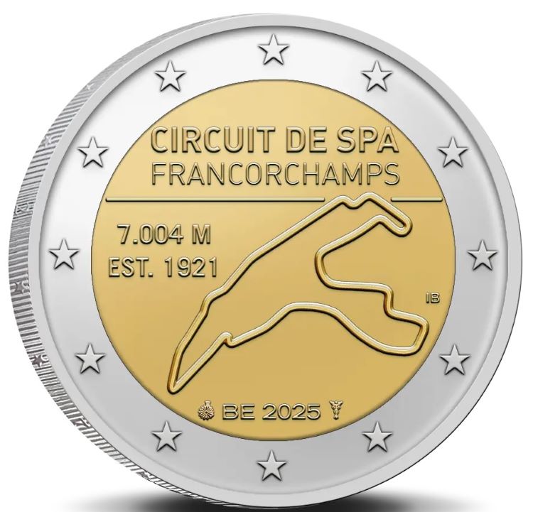 La moneta commemorativa da 2 euro Belgio 2025 – «Circuito di Spa-Francorchamps» è stata emessa per rendere omaggio al celebre circuito di gara situato in Vallonia, noto soprattutto per ospitare il Campionato mondiale di Formula 1 e altre competizioni internazionali di sport motoristici. Il Circuito di Spa-Francorchamps è considerato uno dei più famosi e impegnativi al mondo, con curve iconiche come Eau Rouge e Raidillon, che combinano ripide salite e discese con alte velocità, offrendo un’intensa scarica di adrenalina sia ai piloti che agli spettatori. Il disegno del lato nazionale della moneta raffigura il circuito in una prospettiva dinamica, mettendo in evidenza le sue curve emblematiche e simboleggiando l’eredità storica del Belgio nel motorsport. Sul bordo della moneta sono incisi l’anno di emissione e il nome del paese.